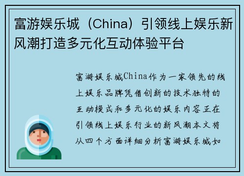 富游娱乐城(China)作为一家领先的线上娱乐品牌,凭借创新的技术、独特的互动模式和多元化的娱乐内容,正在引领线上娱乐行业的新风潮。本文将从四个方面详细分析富游娱乐城如何打造多元化互动体验平台,包括技术创新、互动性提升、用户体验优化和内容多样化。首先,富游娱乐城在技术上的创新,使其平台能够提供更加流畅、安全的娱乐体验;其次,通过多种互动方式的引入,平台增强了用户的参与感和娱乐感;再者,平台在用户体验的优化方面不断发力,提升了用户的满意度;最后,内容的多元化让平台能够满足不同用户群体的需求,进一步提升了其市场竞争力。本文将结合这些方面,深入探讨富游娱乐城如何推动线上娱乐行业的发展,并展望其未来的潜力与挑战。